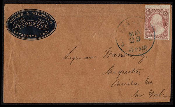 blue LAFAYETTE IND MAY 29 3 PAID c.d.s. on manila envelope bearing fresh blue CHASE & WILSTACH ATTORNEYS, LAFAYETTE IND, embossed oval to Augusta NY. A very fetching cover. Ex. Saadi Sale and Lot Updates (Image) (Image2)