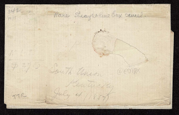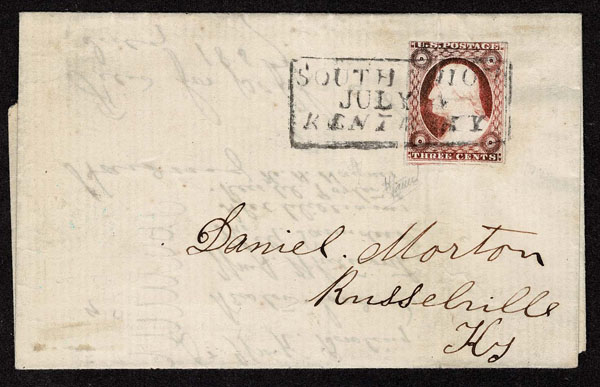 adjoining stamp at bottom, tied by decorative straight line boxed SOUTH UNION JULY 4 KENTUCKY cancel on folded letter with notes indicating the contents were filed July 6th 1857 to Russellville KY. Very artistic and attractive. Ex. Saadi