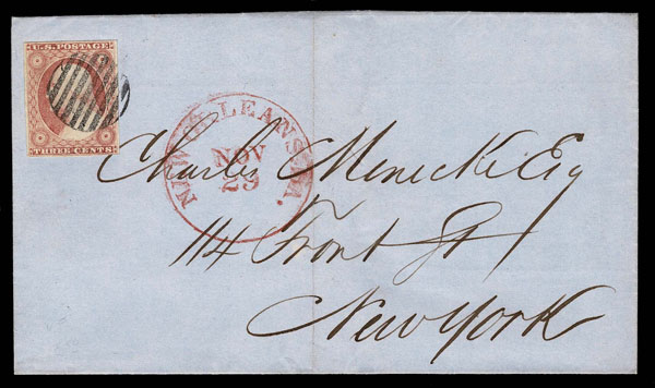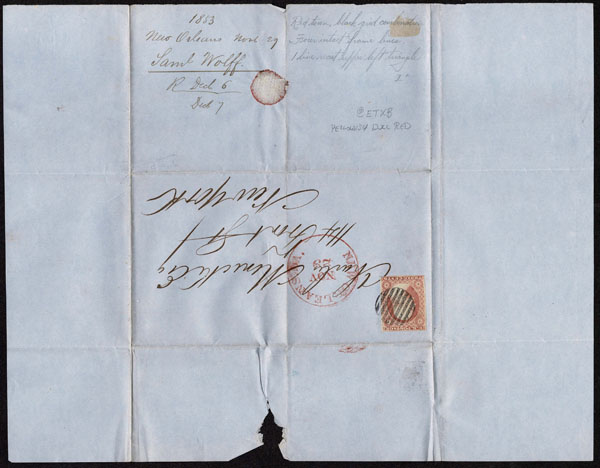 margins all around tied by seven bar grid cancel on bluish folded letter sheet bearing large red NEW ORLEANS LA 29 c.d.s, on reverse docketed 1853, to New York. Ex. Saadi Sale and Lot Updates (Image) (Image2)