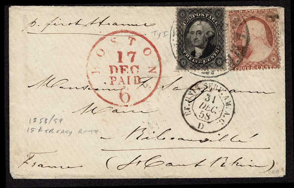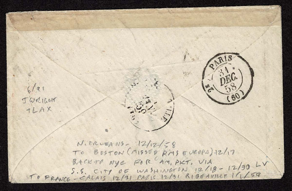 envelope bearing red BOSTON 17 DEC PAID 6 transit (missed RMS Europa) following "p first steamer", thence to NY (ss. City of Washington) to PARIS 31 DEC 58, then to RIBEAVILLE JAN 1 39 receiver on reverse all noted in pencil. Sale and Lot Updates (Image) (Image2)