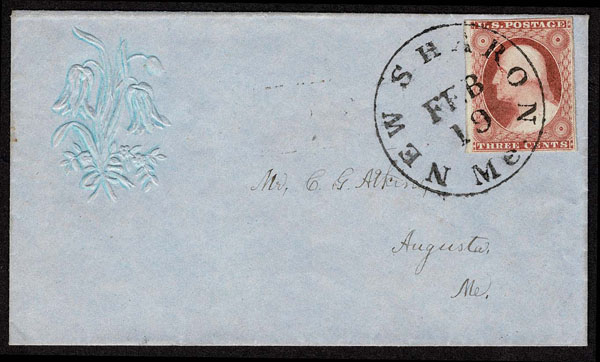 all around, frame-line touched at top, tied by crisp NEW SHARON FEB 19 ME c.d.s. on neat small blue flower embossed envelope to Augusta Maine. Ex. Saadi Very pretty cover. Sale and Lot Updates (Image) (Image2)