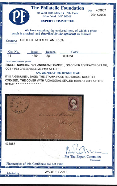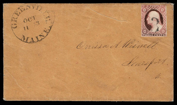 cancelled by large "3" on manila envelope bearing GREENVILLE OCT 11 53 MAINE c.d.s. to Searsport. The letter to family tells of life, finances and the singing of a lady at church. A great rarity. Ex. SaadiFoundation Cert.(2006).