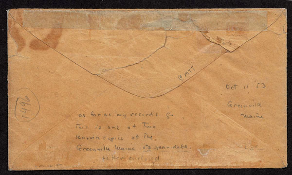 Purchase note on back, "one of two known covers with '53" in c.d.s. from Greenville, ME Sale and Lot