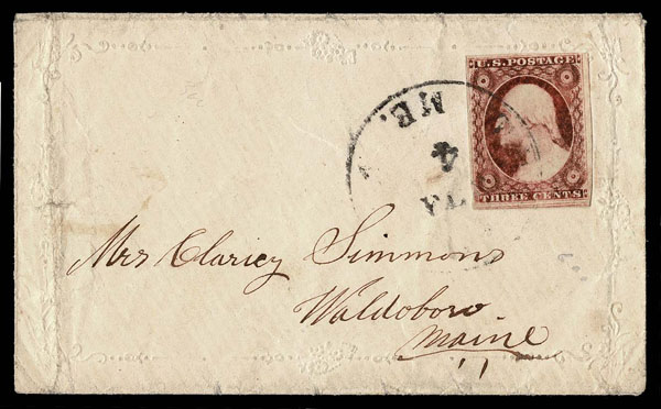 UNITED STATES: Maine; 1851-1855 3c brownish carmine, large margins to frame lines intact, tied by ______ ME c.d.s. on