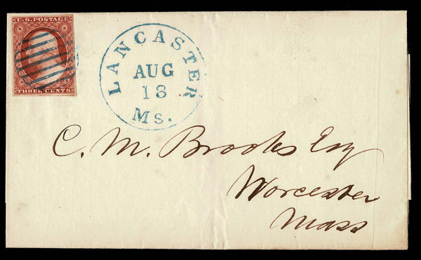 around sharing portion of adjacent stamp a bottom, tied by lovely blue seven bar circled in grid cancel on folded letter sheet bearing matching blue LANCASTER AUG 18 MS c.d.s. to Worcester Mass. Ex. Saadi Sale and Lot Updates (Image) (Image2)