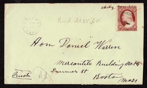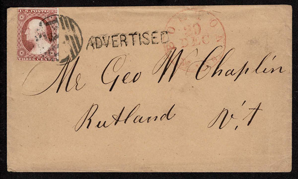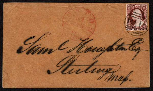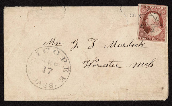 UNITED STATES: Massachusets; 1851 - 1852, 3c claret, ADVERTISED cover. margins three sides, adjacent stamp at top tied