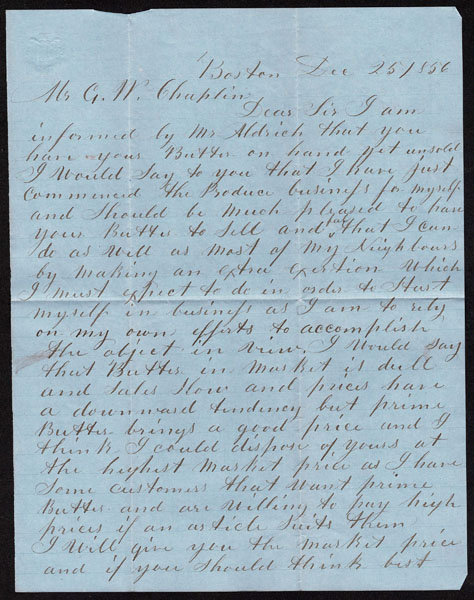 by Boston PAID in grill on light manila envelope with enclosure date lined 1956 concerning the purchase of butter, red Boston 29 DEC MASS c.d.s. and Rutland (VT) ADVERTISED handstamp. The letter was undelivered, hence advertised dated Christmas Day.