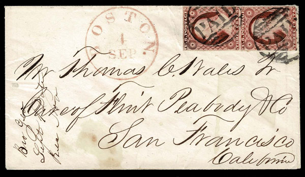 all around, tied by BOSTON PAID circular grid cancels on envelope (embossed on reverse) bearing red BOSTON 4 SEP c.d.s. to Flint, Peabody and Company, S.F. California. Ex. Saadi Sale and Lot Updates (Image) (Image2)