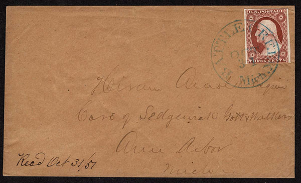1851 to 1861 3c Red - Michigan. UNITED STATES: Michigan; 1851 - 52, 3c brownish carmine , good to large margins