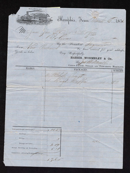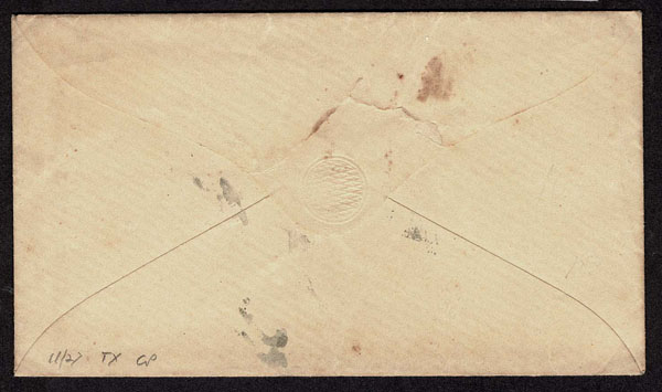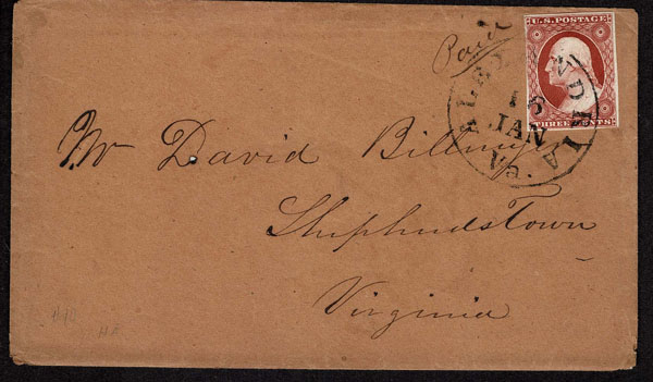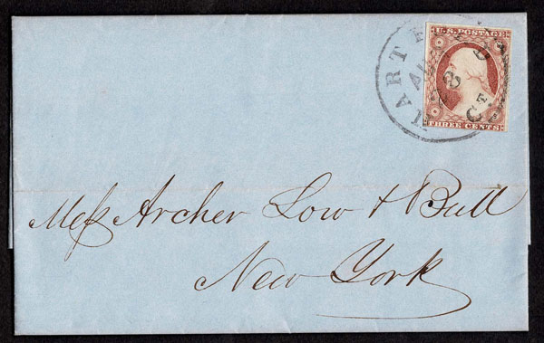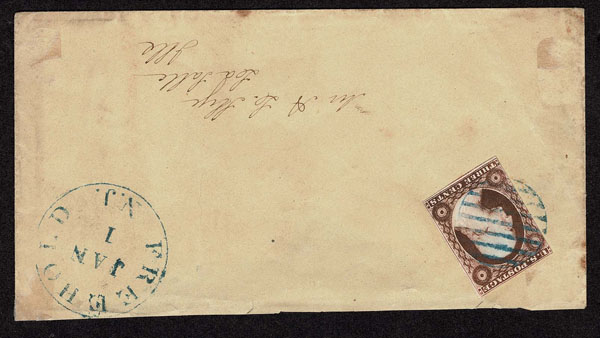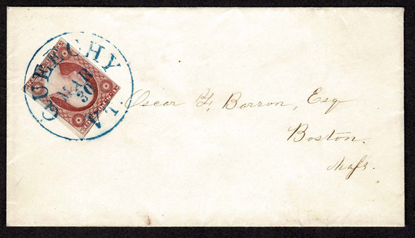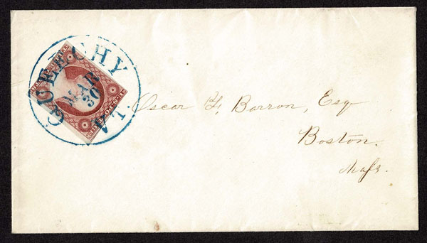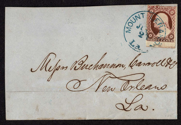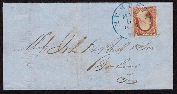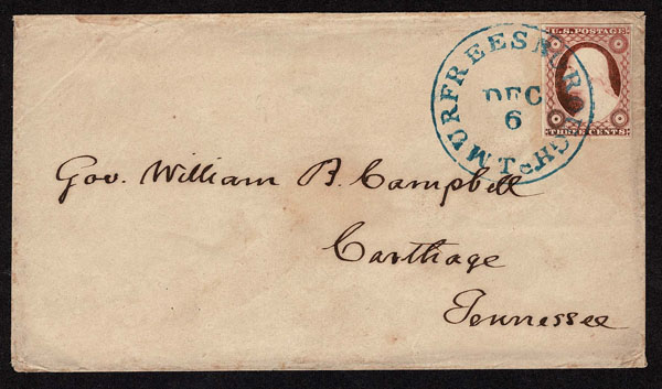 to large margins showing portion of adjacent stamp at top, tied by large blue MURFREESBOROUGH Te DEC 6 c.d.s. to Carthage. A large cancel for a big name and a "big-wig" (the govenor).. Ex. Saadi Tennessee Governor William Bowen