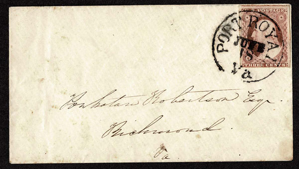 UNITED STATES: Virginia; 1856 3c brownish carmine Plate 5L. margins all around tied by light blue NORFOLK VA JUNE 14