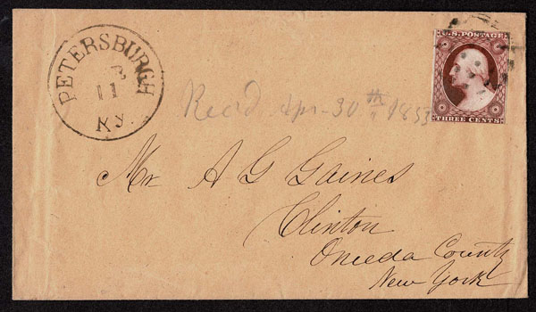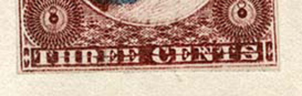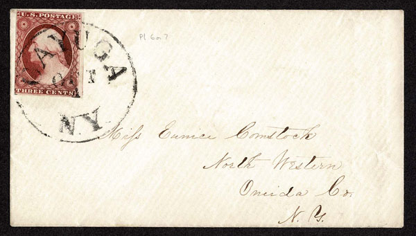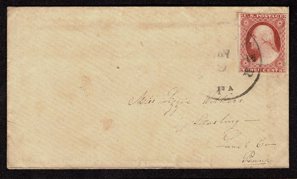 UNITED STATES: Pennsylvania; 1852-55 3c brownish carmine position 92 L1L, (some oxidizing) margins all around, but