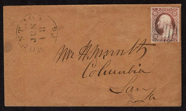 1851 to 1861 3c Red - South Carolina. UNITED STATES: South Caroline; 1852-1855 3c brownish carmine , margins just