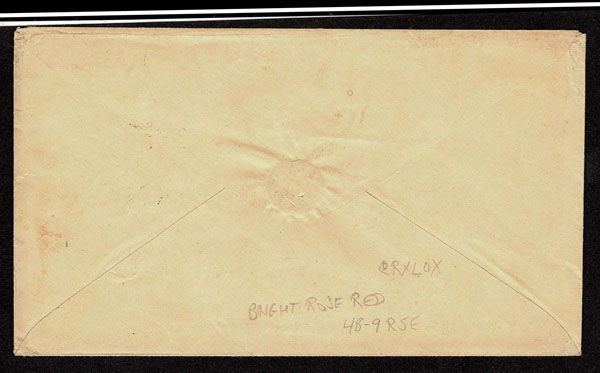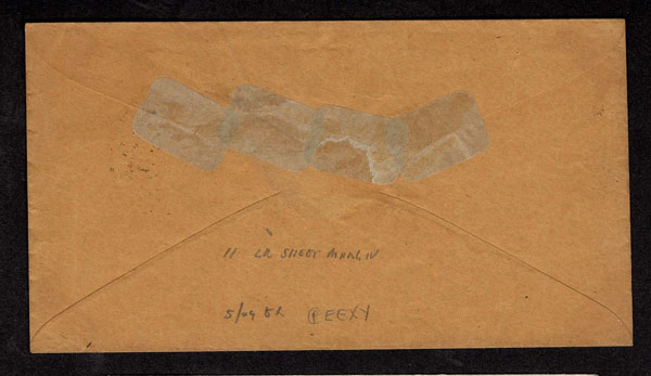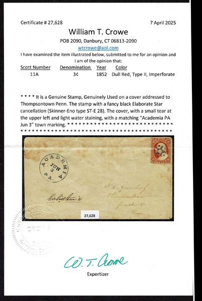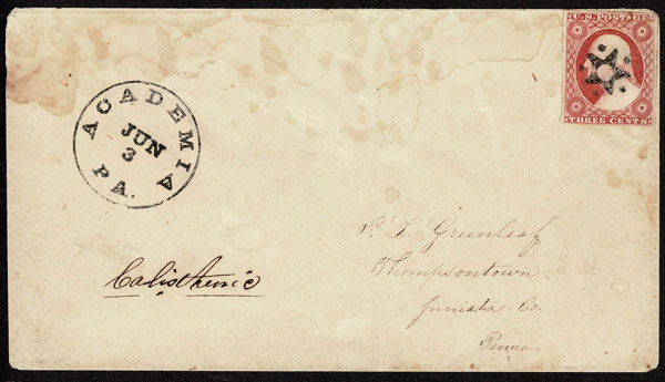 cancel, on envelope to Thompsontown Pennsylvania, small tear at left and light staining. ACADENIA PA June 3 c.d.s. . Crowe Cert.(2025). (Skinner-Eno type ST-E-28) On reverse of the cover are notations HR & Co 9-18-51 LWBM,