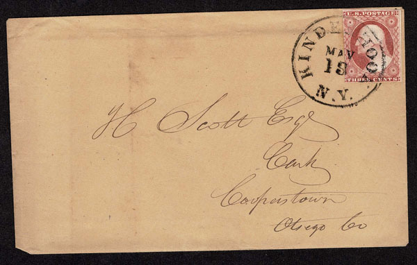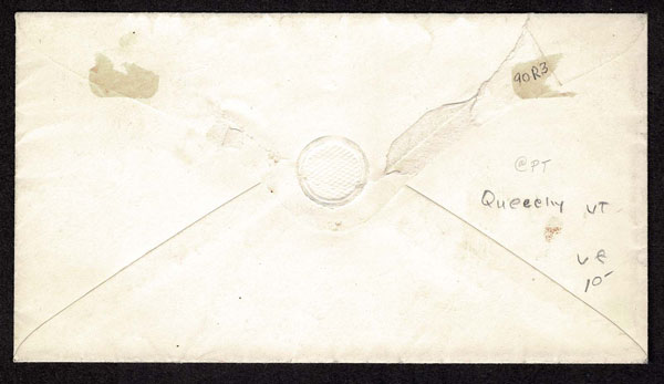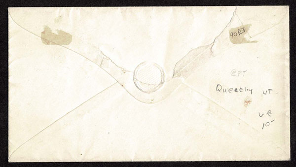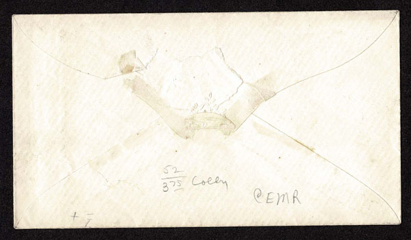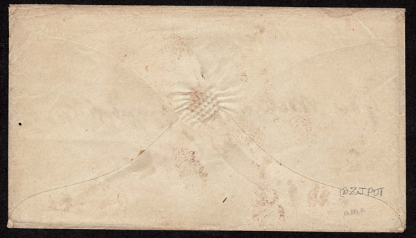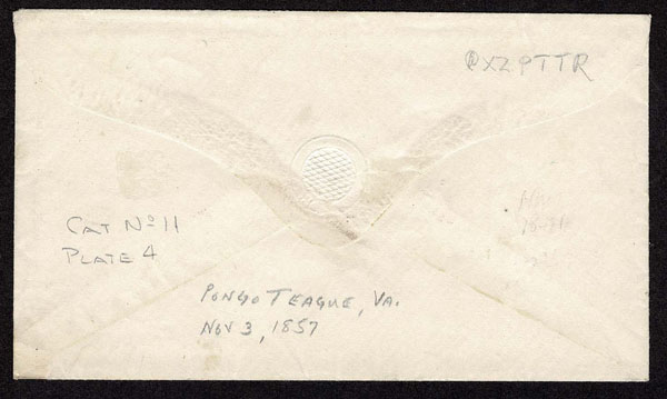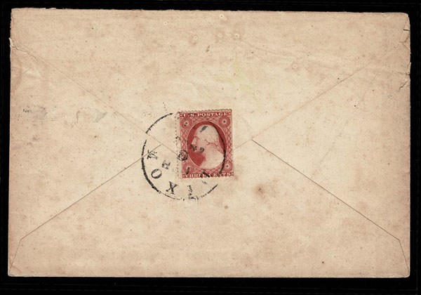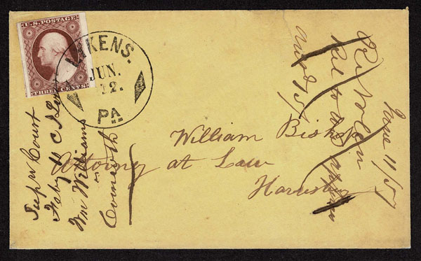 UNITED STATES: Pennsylvania; 1857 3c claret , (SE at left), tied on reverse of valentine envelope (a bit toned) by DIXON