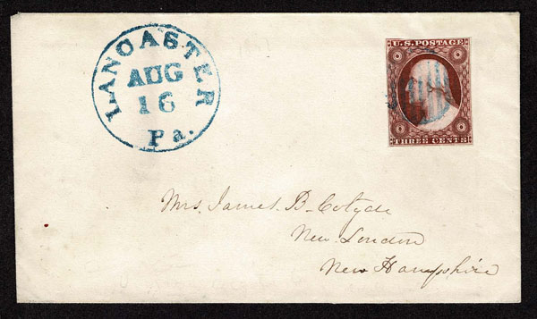 slightly touched at top center, just tied by dark blue grill, bearing matching LANCASTER Pa AUG 16 c.d.s. to New London, N.H.. Distinctive variety "Line through THREE CENTS". Incredible stamp impression. Ex Saadi Sale and Lot Updates (Image) (Image2)