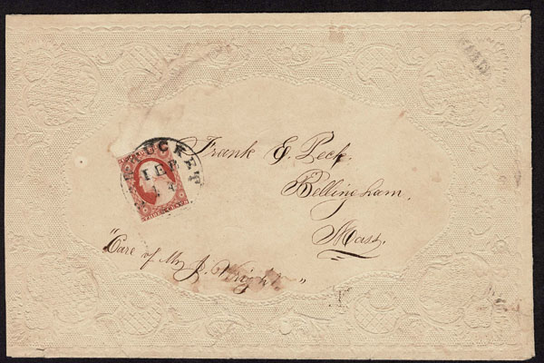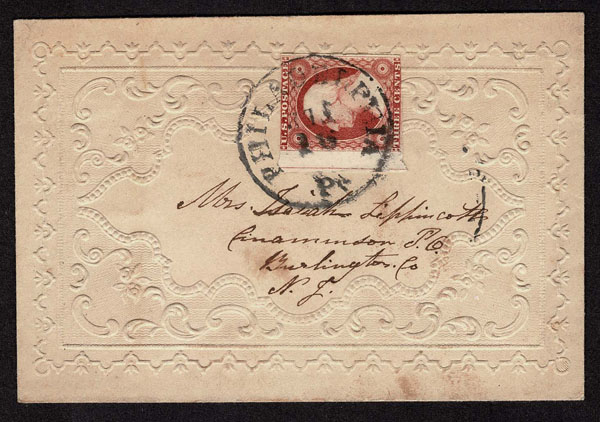 UNITED STATES: Pennsylvania; 1857 3c red, cancelled by circular grill on elegant valentine envelope, bearing PHILADELPHIA