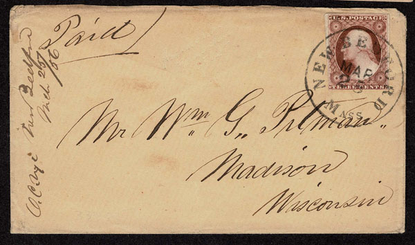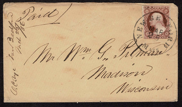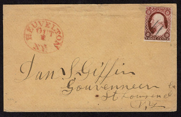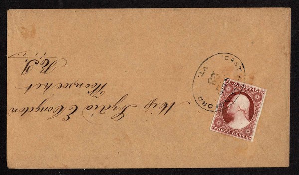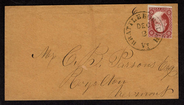 1851 to 1861 3c Red - Vermont. UNITED STATES: Vermont; 1856 3c brownish carmine , large margins all around, portions
