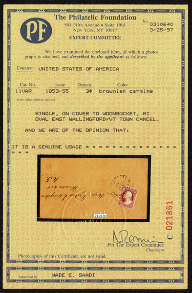 of adjacent stamps top and bottom, tied by oval EAST WALLINGFORD VT SEP 23 oval and date stamp on manila envelope to Woonsocket RI. Lovely stamp and cover. Ex SaadiFoundation Cert. (1997). Sale and Lot Updates (Image) (Image2)