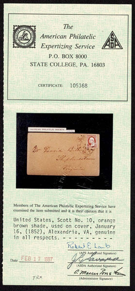 around. Bright red color and impression tied by ALEXANDRIA VA 16 JAN c.d.s. on manila local envelope, manuscript "paid" to Shiplandstown Va. Ex SaadiAPEX Cert (1997). Sale and Lot Updates (Image) (Image2)