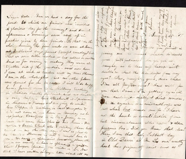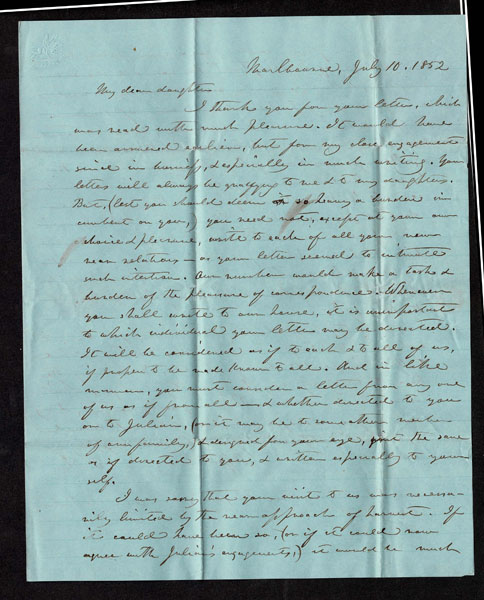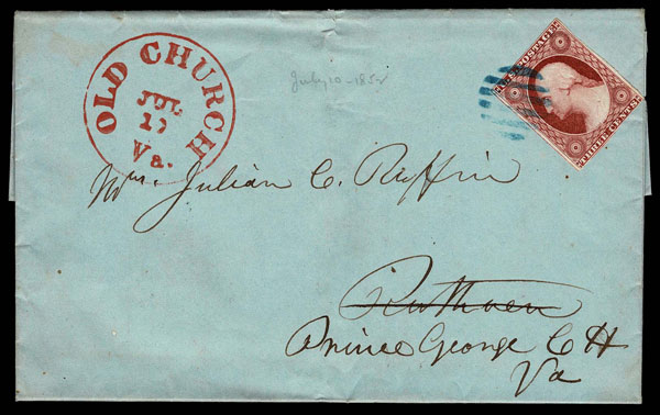 by cute blue bar cancel on folded letter (date -lined 1852) bearing lovely red OLD CHURCH VA JUL 10 c.d.s., readdressed to Prince George CH Va. Very attractive letter to their daughter. Ex Saadi Sale and Lot Updates (Image) (Image2)