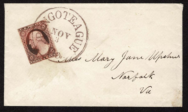 PONGOTEAGUE VA NOV 3 (1877) c.d.s. on neat envelope (corner fault) to Norfolk. Rare and impressive cover.. Ex Saadi Sale and Lot Updates (Image) (Image2)