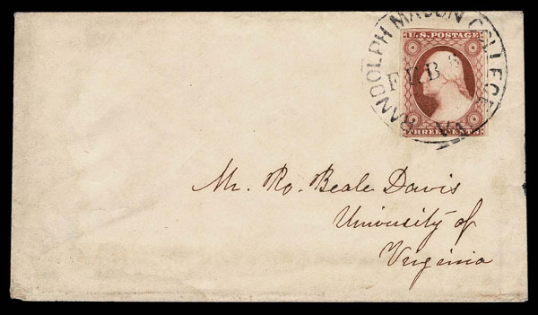 tied by strong RANDOLPH MASON COLLEGE VA, FEB 5 c.d.s. on neat envelope to University of Virginia. Ex Saadi Rare and impressive cancel. Sale and Lot Updates (Image) (Image2)