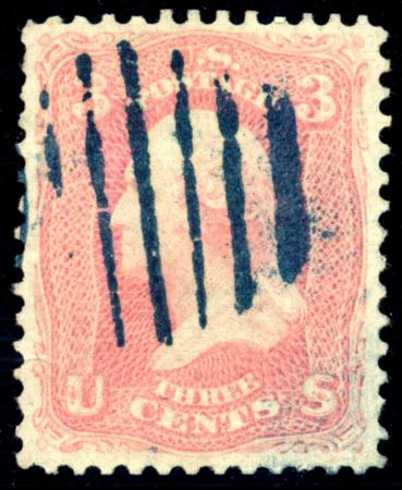 US - Classics - Scott 1-111. Scott 64b, XF, with 1966 PF Cert, bluish indigo 7 bar grid cancel, 1861 3c Rose Pink CV $160 as VF only (Image)