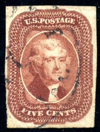 US - Classics - Scott 1-111. Scott 12, VF-XF, "Absurdly" Light Cancel, with PF Cert., 1856 5c Red Brown, Imperforate CV $750.00 (Image)