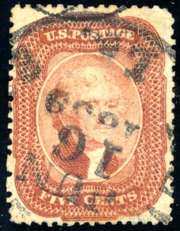 US - Classics - Scott 1-111. Scott 27, F-VF, "JUN 16 1859" cds cancel, 1858 5c Brick Red CV $1450.00 (Image)