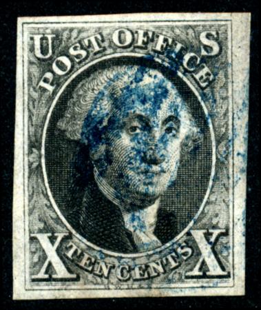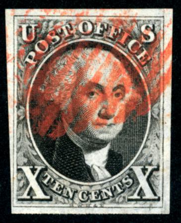 US - Classics - Scott 1-111. Scott 2, 4 margins, Red Grid Cancel, PF Cert., 1847 10c Black CV $850.00 (Image)