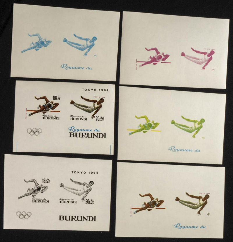 |**|Yvert B5. 1964. Olympic games-Tokio 1964. Group of progressive plate proofs of the set. TO EXAM. Description of lots is limited to the cataloguing of the stamps and their characteristics. The total of the material included