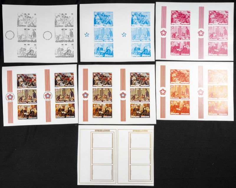 |**|Yvert 1284/89. 1976. US Bicentenary. Group of progressive plate proofs of the set. TO EXAM. Description of lots is limited to the cataloguing of the stamps and their characteristics. The total of the material included in