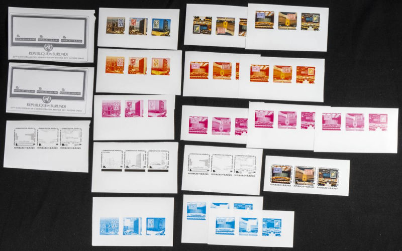 |**|Yvert 1399/22. 1977. 25 º Aniversaire U.N.O. post. Group of progressive plate proofs of the set. TO EXAM. Description of lots is limited to the cataloguing of the stamps and their characteristics. The total of the material