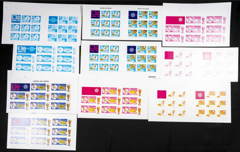 |**|Yvert 386/88. 1974. World Cup Football. Group of progressive plate proofs of the set. TO EXAM. Description of lots is limited to the cataloguing of the stamps and their characteristics. The total of the material included in