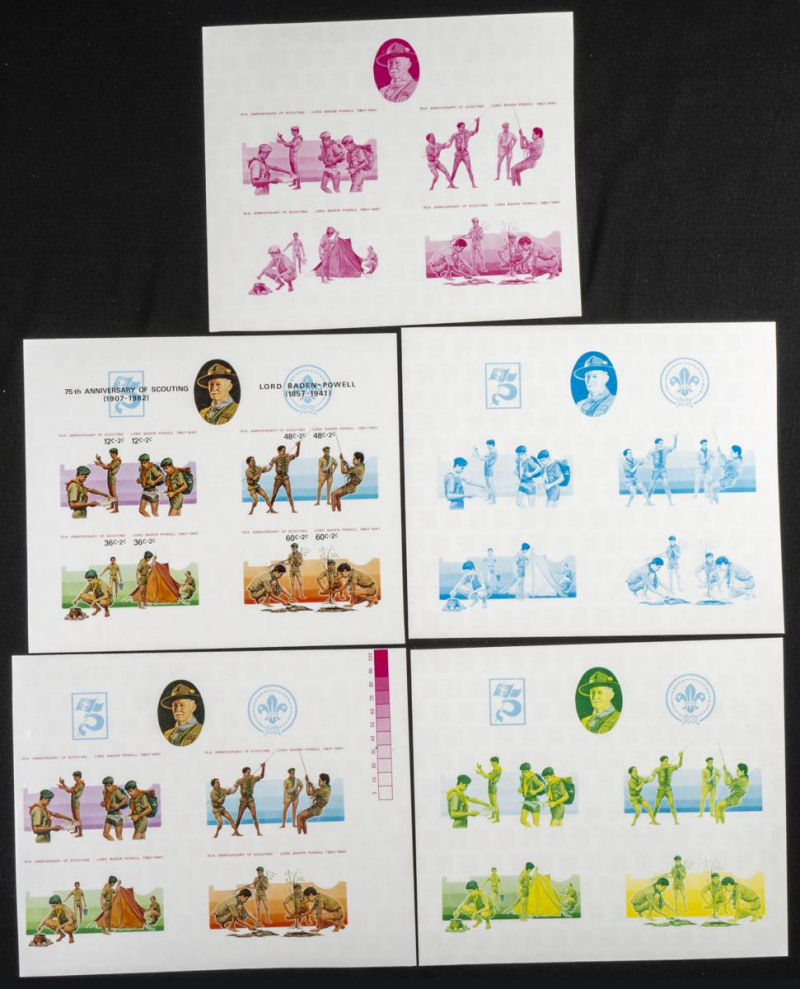 |**|Yvert B132. 1983. Scouting. Group of progressive plate proofs of the set. TO EXAM. Description of lots is limited to the cataloguing of the stamps and their characteristics. The total of the material included in each case is