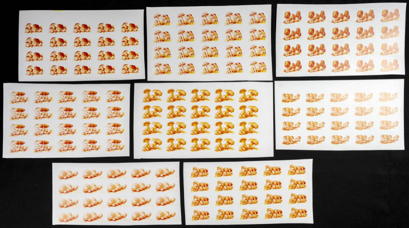 |**|Yvert 576/80. 1977. Mushrooms. Group of progressive plate proofs of the set. TO EXAM. Description of lots is limited to the cataloguing of the stamps and their characteristics. The total of the material included in each case