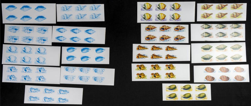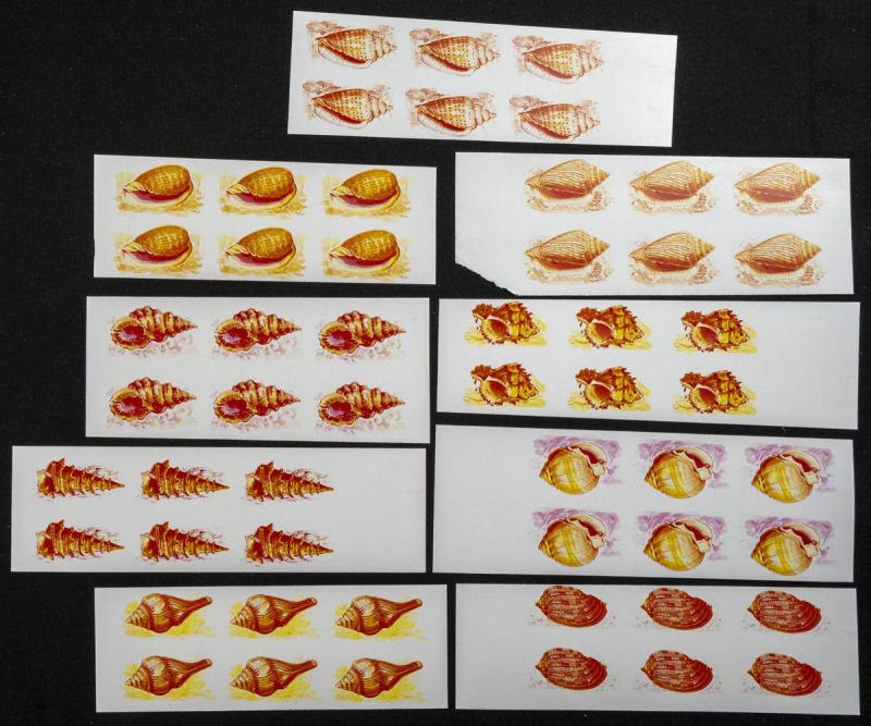 |**|Yvert 581/89. 1977. Shells. Group of progressive plate proofs of the set. TO EXAM. Description of lots is limited to the cataloguing of the stamps and their characteristics. The total of the material included in each case is