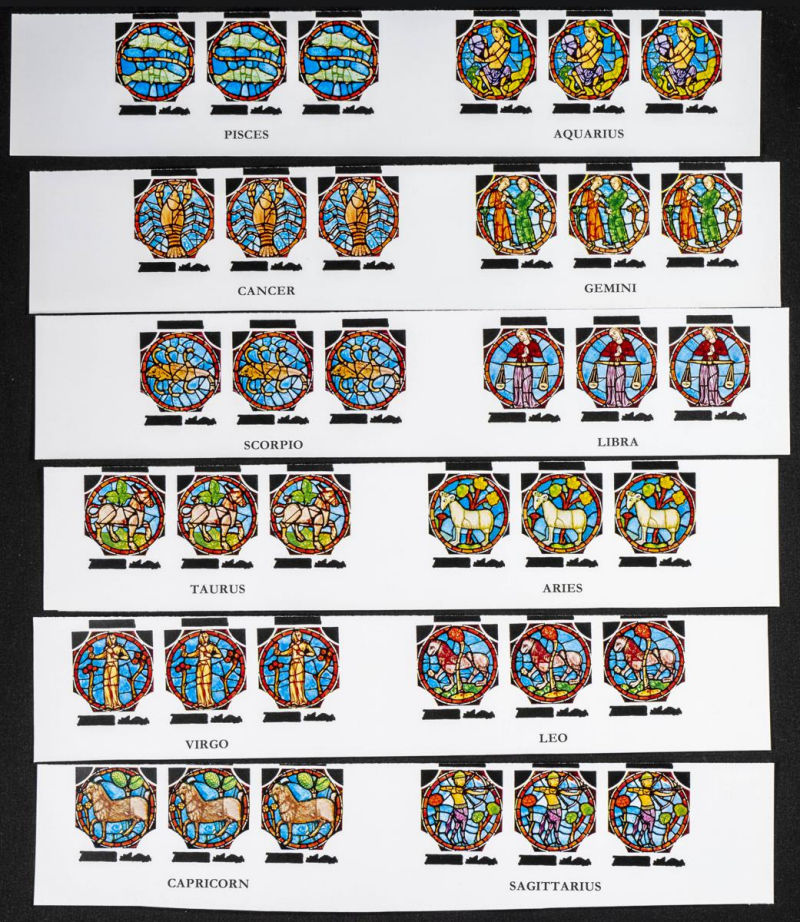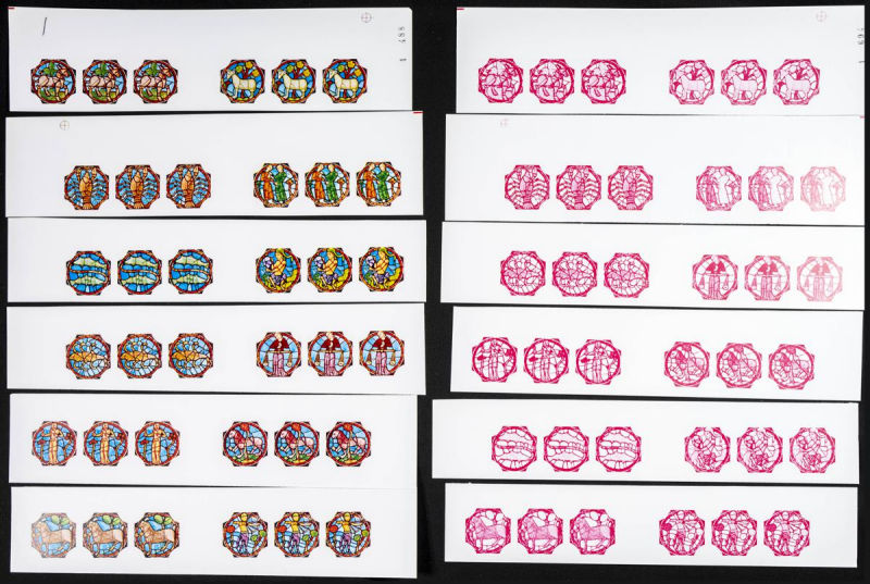 1971. Zodiac, Notre Dame windows. Group of progressive plate proofs of the set. (Michel: 769/80). TO EXAM. Description of lots is limited to the cataloguing of the stamps and their characteristics. The total of the material included in each