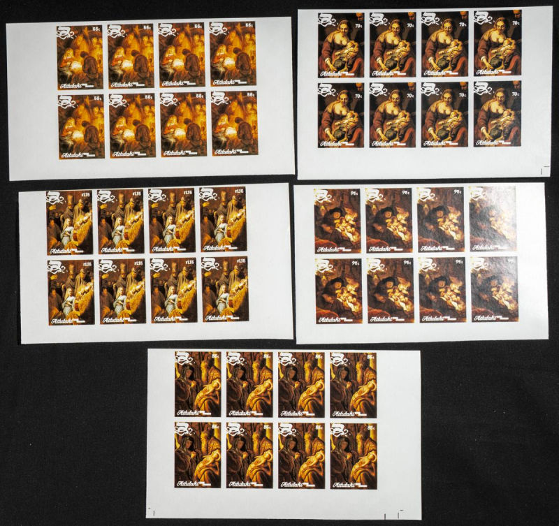 |**|Yvert 476/80. 1988. Christmas, Rembrandt. Group of progressive plate proofs of the set. TO EXAM. Description of lots is limited to the cataloguing of the stamps and their characteristics. The total of the material included