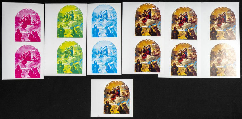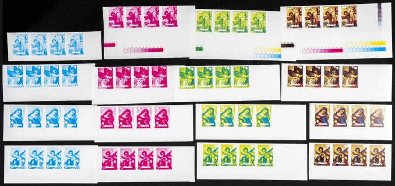 |**|Yvert B74. 1989. Christmas, Titian painting. Group of progressive plate proofs of the set. TO EXAM. Description of lots is limited to the cataloguing of the stamps and their characteristics. The total of the material