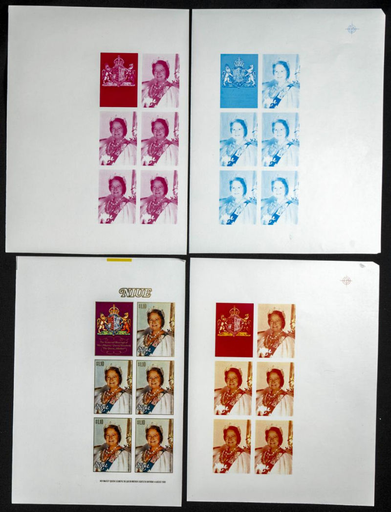 |**|Yvert B37. 1980. Queen mother. Group of progressive plate proofs of the set. TO EXAM. Description of lots is limited to the cataloguing of the stamps and their characteristics. The total of the material included in each case