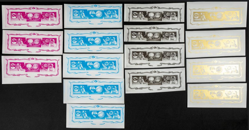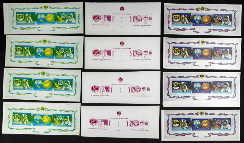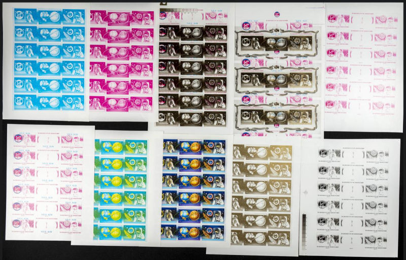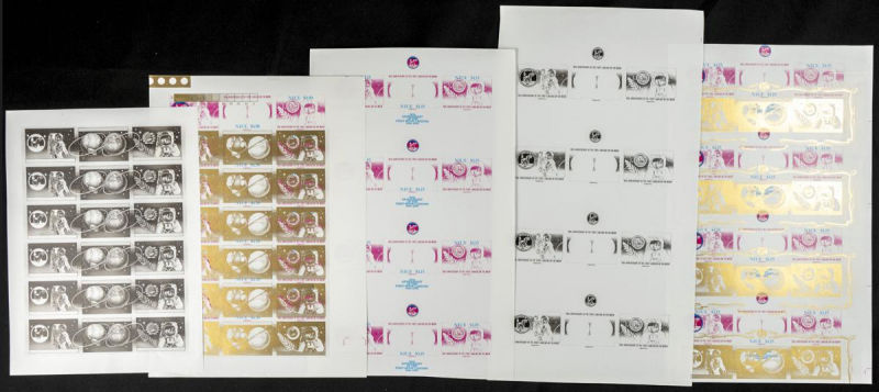 |**|1989. Moonlanding anniversary. Group of progressive plate proofs of the set. (Michel: B114). TO EXAM. Description of lots is limited to the cataloguing of the stamps and their characteristics. The total of the material