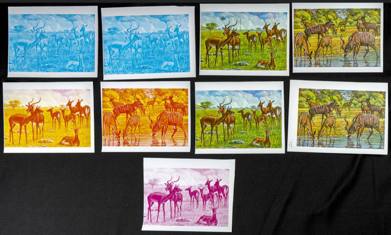 |**|Yvert B45/46. 1975. Antelopes. Group of progressive plate proofs of the set. TO EXAM. Description of lots is limited to the cataloguing of the stamps and their characteristics. The total of the material included in each case