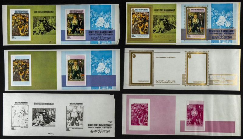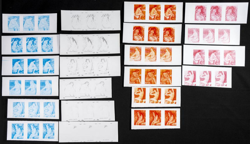 |**|1970. Renoir paintings. Group of progressive plate proofs of the set. (Michel: 270/75). TO EXAM. Description of lots is limited to the cataloguing of the stamps and their characteristics. The total of the material included
