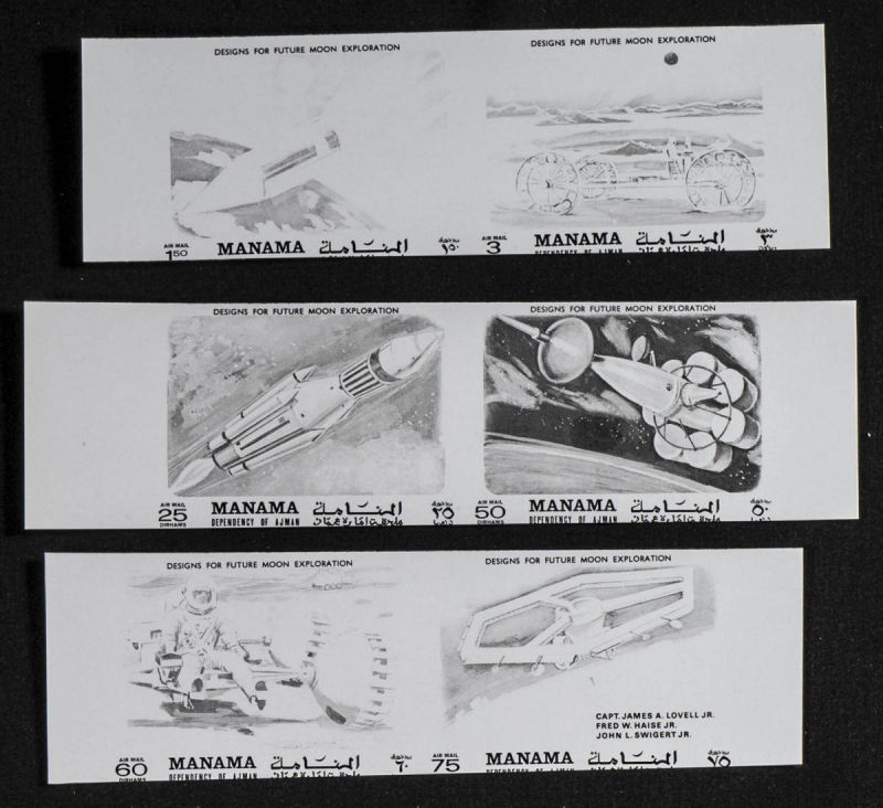 |**|1970. Apollo 13. Group of progressive plate proofs of the set. (Michel: 291/96). TO EXAM. Description of lots is limited to the cataloguing of the stamps and their characteristics. The total of the material included in each