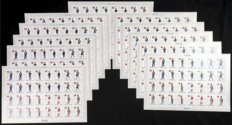 |**|1971. British military uniforms. Group of IMPERFORATED sets. (Michel: 824/31). TO EXAM. Description of lots is limited to the cataloguing of the stamps and their characteristics. The total of the material included in each