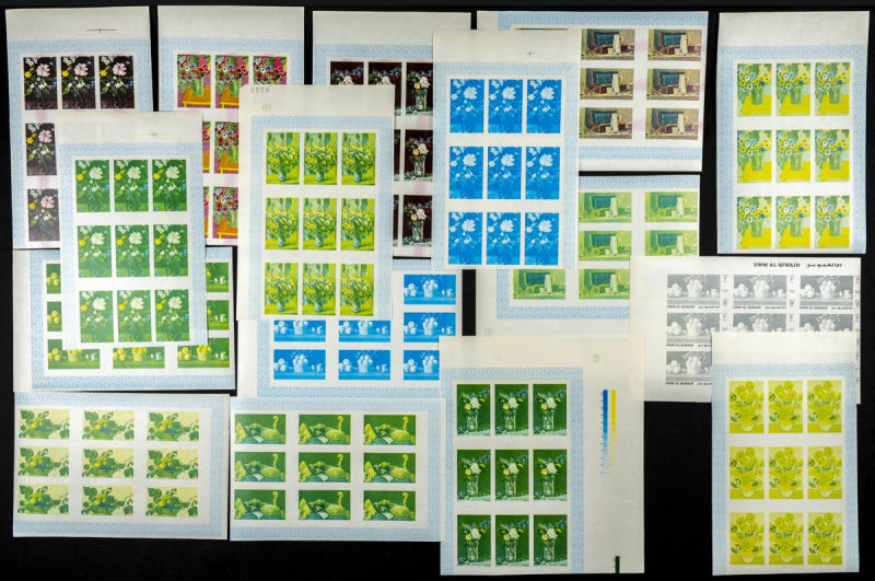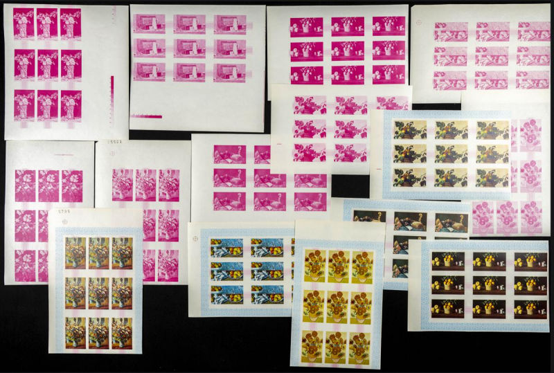 |**|1968. Flower paintings. Group of progressive plate proofs of the set. (Michel: 275/84). TO EXAM. Description of lots is limited to the cataloguing of the stamps and their characteristics. The total of the material included