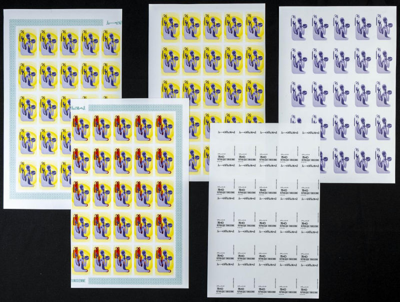 |**|Yvert 794/99. 1975. Handicraftsman and his Products. Group of progressive plate proofs of the set. TO EXAM. Description of lots is limited to the cataloguing of the stamps and their characteristics. The total of the material
