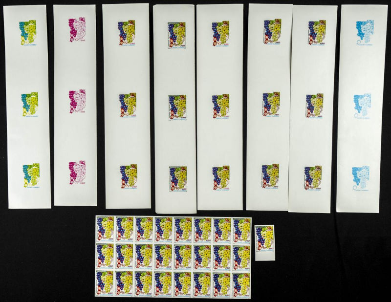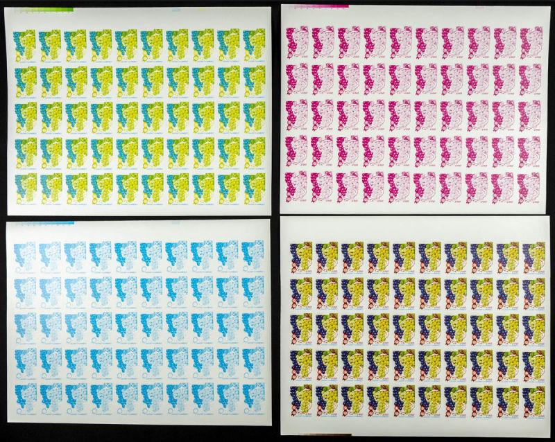 |**|Yvert 1090. 1987. International wine year. Group of progressive plate proofs of the set. TO EXAM. Description of lots is limited to the cataloguing of the stamps and their characteristics. The total of the material included
